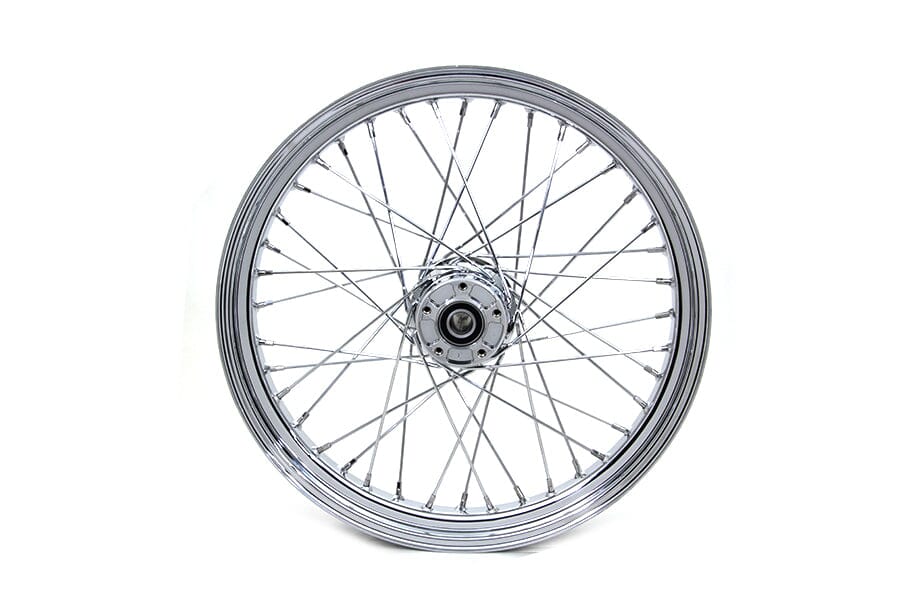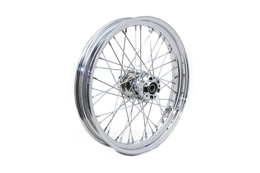 V-Twin Manufacturing 19" Front Spoke Wheel - Sold Each Features a 19" x 2.5" drop center rim, a chrome hub with 25mm bearings, and 40 stainless steel spokes. Both sides of the hub are drilled to accept discs. Single and dual disc wheel is assembled and ready to bolt onto 49mm forks. Fits: