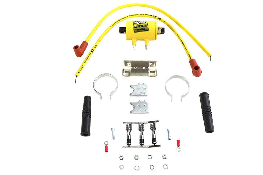 V-Twin Manufacturing Accel High Energy Coil, Kit 1965-87 - Sold Each Accel high engery dual fire type coil kit features a very high KV engery output that requires it to be used with extreme service 8.8mm silicone racing wires. Each coil is complete with two 8.8mm wire leads and appropriate chrome brackets. **NOTE:Chec