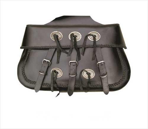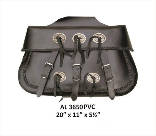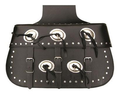 Medium studded throw-over Saddle Bag PVC Medium studded throw-over Motorcycle Saddle Bag with conchos in PVC with Quick Release for easy access. D ring on lower center back with laces for rear attachment. PVC is naturally waterproof. Dimensions are 12 1/2" x 9" x 6"