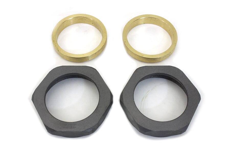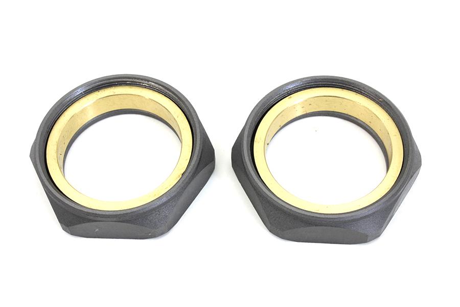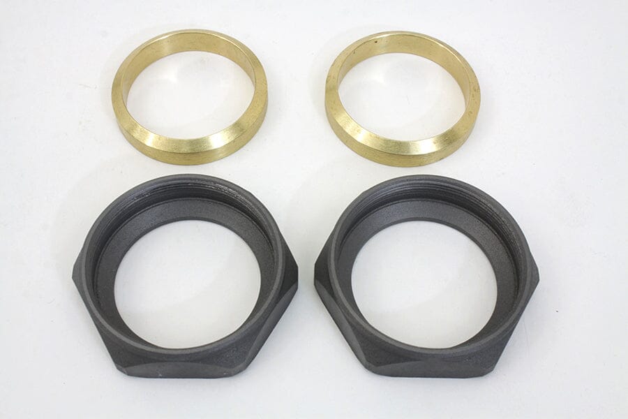 Parkerized intake manifold nuts with brass seals. Note: For use with a 3-bolt 61 manifold on large port knuckleheads. Note: The seals are thicker than stock and the nuts fit these seals only. 1941-1947 FL