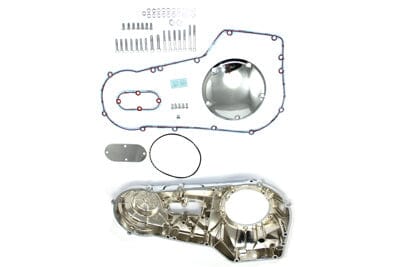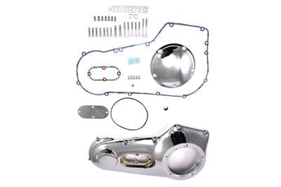 Chrome 5-speed outer primary cover kit includes primary cover, allen screws, starter bushing and gaskets for derby, inspection and outer cover.