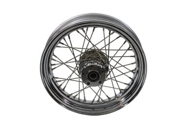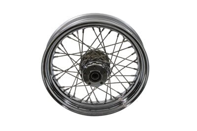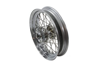 16" x 3.00" rear wheel assembly features polished stainless steel spokes, chrome hub with 1" bearings, & a chrome drop center rim with small center valve stem.