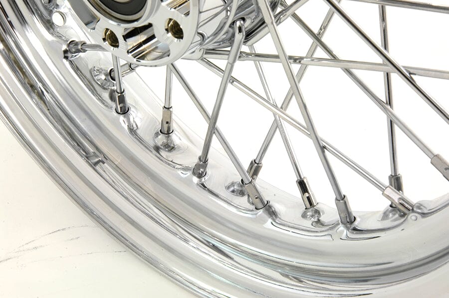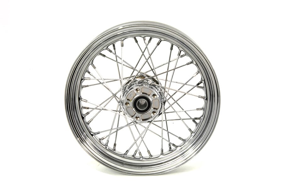 16" x 3.00" rear wheel assembly are laced, trued and includes bearings installed and chrome spokes. Accepts 130-140 tires.