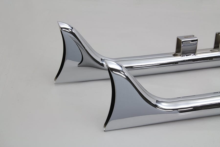 Chrome straight fishtail 36 muffler set has an outer diameter of 1-7/8 for M8 models. Fishtails are straight through without baffles. The stock pipe diameter measures to be 4.33 . The fish tail set measures 1-7/8 for its outer diameter. Extension pipes have channel mount brackets that are welded in place. Includes channel mount on top of the pipe to mount like the original. Use existing hardware and clamps for installation. Not legal for street use! *NOTE: The right hand fishtail has 2-1/2 inlet and the left side fishtail has 1-3/4 inlet. 2017-UP FLT