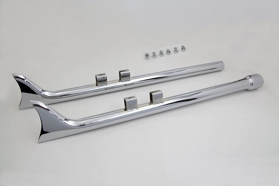 Chrome straight fishtails are 36 long with a 1-7/8 diameter and features scalloped ends. Utilizes channel brackets. Extension pipes have channel mount brackets that are welded in place. Includes channel mount on top of the pipe to mount like the original. Use existing hardware and clamps for installation. Order replacement T-bolts separately if required. 1995-2016 FLT