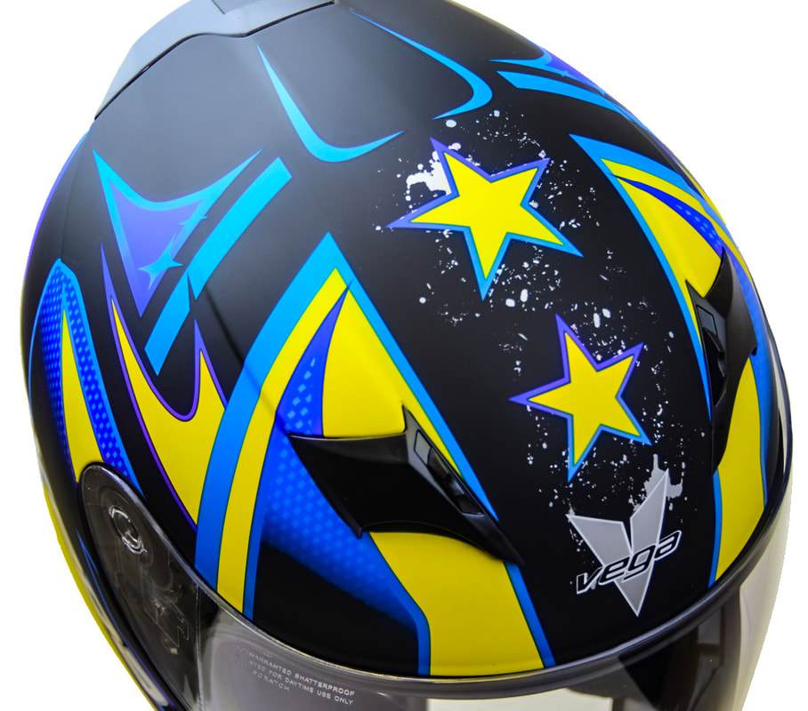 Aerodynamic, poly carbonated shell has 3 large adjustable air intake ports and massive rear exhaust, combined with a channeled inner EPS for maximum air flow.
