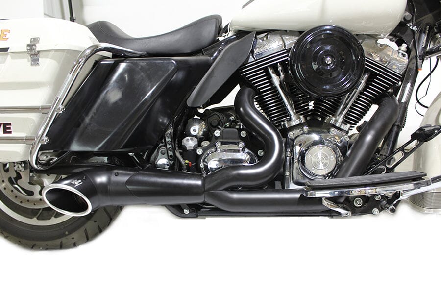 Black 2:1 exhaust header set features lake style 3" big diameter turn out ends that are baffled, full coverage black heat shields and 1-3/4" header tubes. Turn out end is clamped on and will allow the installer to rotate into the desired position.